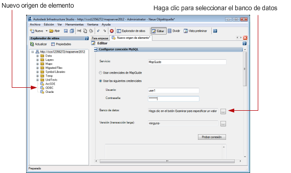 Se muestra el Editor de conexiones a la derecha del Explorador de sitios.
