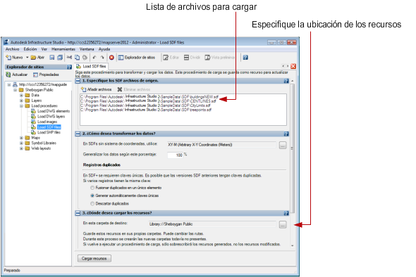 En este procedimiento se asume que se desea cargar uno o más archivos SDF 2 o SDF 3. Para cargar un archivo SDF, arrastre uno o más archivos de origen al Explorador de sitios. Autodesk Infrastructure Studio convierte los archivos SDF 2 al formato SDF 3 y crea automáticamente una capa para cada archivo, así como un nuevo origen de elemento.