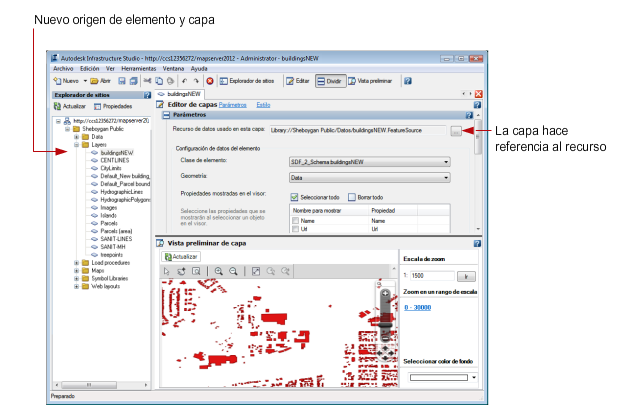 Autodesk Infrastructure Studio crea un origen de elemento y una capa para cada archivo SDF.