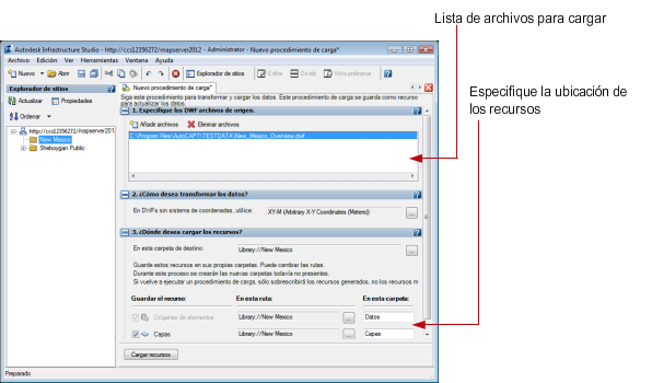 En este procedimiento se asume que se desea cargar uno o varios archivos DWF. Para cargar un archivo DWF, arrastre el archivo de origen al Explorador de sitios. Autodesk Infrastructure Studio crea automáticamente una nueva capa así como un nuevo origen de elemento.