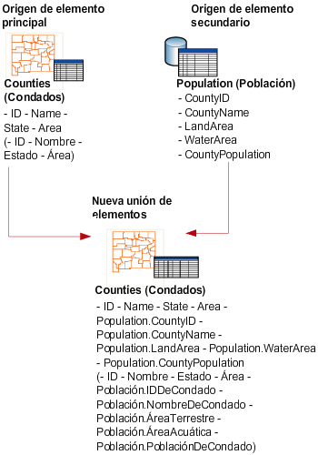 La siguiente ilustración muestra un ejemplo de la relación entre un origen de elemento que contiene fronteras de estado o condado y otro origen de elemento que contiene datos censales.