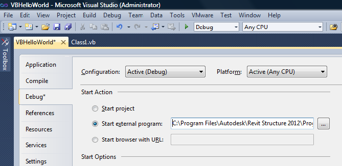 - In the Debug window Start Action section, click Start external program and browse to the Revit.exe file. By default, the file is located at the following path, C:\Program Files\Autodesk\Revit Structure 2012\Program\Revit.exe.