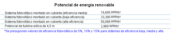 Al revisar un análisis energético en el cuadro de diálogo Resultados y comparación, esta tabla resume la cantidad de electricidad que el emplazamiento de construcción podría producir mediante el uso de paneles solares y turbinas eólicas.