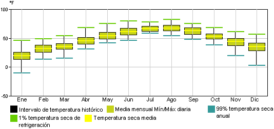 Media mensual Mín/Máx diaria | El promedio de temperaturas secas diarias mínima y máxima para cada mes. |