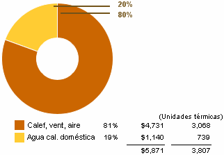 Al revisar un análisis energético en el cuadro de diálogo Resultados y comparación, este diagrama compara el uso de combustible estimado para climatización y para agua caliente doméstica.