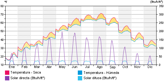 El eje Y de la izquierda es la temperatura y el eje Y de la derecha es la radiación solar en BTU por hora por área.
