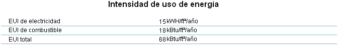 EUI total | Medida de la combinación de electricidad y combustible usado en cada proyecto, por área común del piso al año. Para esta medida, el uso de electricidad se convierte como se indica a continuación: