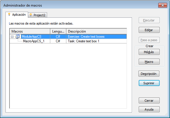 - En el Administrador de macros, seleccione la ficha Aplicación (para macros de nivel de aplicación) o una ficha de proyecto (para macros de nivel de documento) en que colocar la macro.