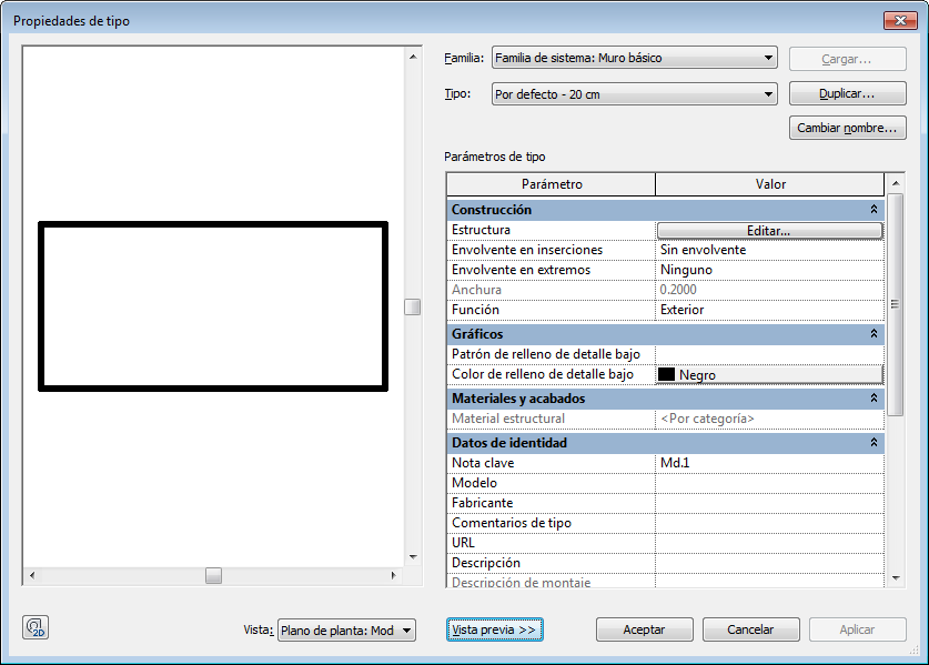Éste es un ejemplo del cuadro de diálogo Propiedades de tipo de un tipo de muro, con el panel Vista previa mostrado.