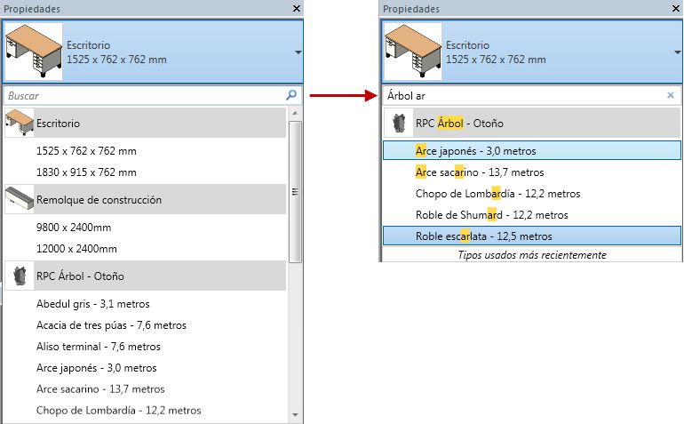 Revit tiene disponible una función de búsqueda para facilitar la selección entre una larga lista de opciones. Puede buscar en las siguientes áreas funcionales: