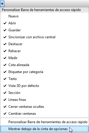 La barra de herramientas de acceso rápido se puede mostrar encima o debajo de la cinta de opciones. Para cambiar esta configuración, en la barra de herramientas de acceso rápido, haga clic en el menú desplegable Personalizar barra de herramientas de acceso rápido