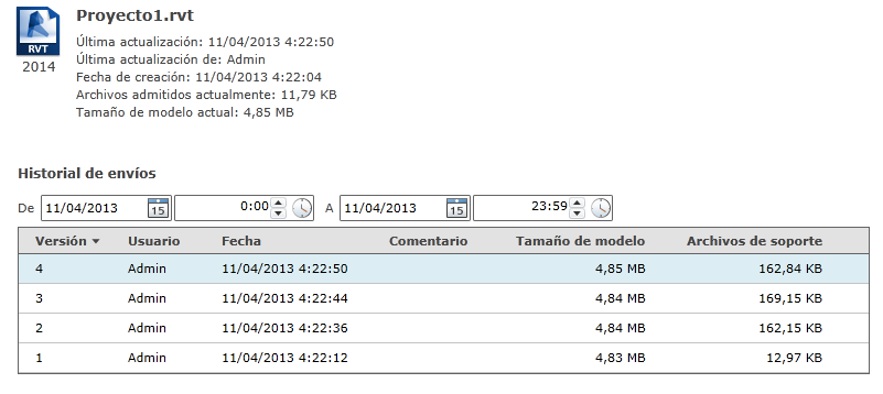 Al seleccionar un modelo en el control de árbol, en el panel derecho se visualiza el historial de las ediciones que se han ejecutado, así como los comentarios escritos por los miembros del equipo, como se muestra a continuación. Utilice el filtro de fecha para visualizar elementos entre fechas especificadas.