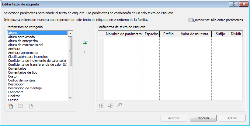 La ventana de parámetros de categoría contiene los parámetros de texto de etiqueta relacionados con el tipo de etiqueta. La ventana Parámetros de texto de etiqueta contiene los parámetros de categoría que aparecen en el texto de etiqueta. Por lo general se trata de un solo parámetro, pero puede definir textos de etiquetas más complejos.