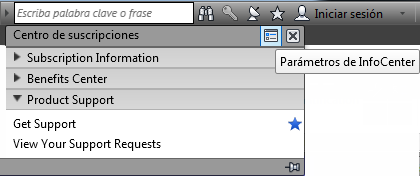 InfoCenter incluye un conjunto de herramientas a la derecha de la barra de título, las cuales permiten acceder a varias fuentes de información relacionadas con el producto.