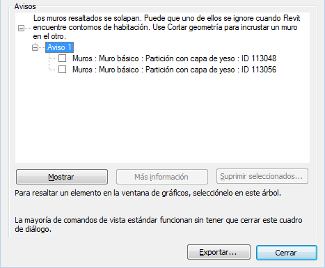Expanda los elementos para ver los elementos individuales asociados a cada aviso. Al seleccionar el texto que se encuentra cerca del aviso, el elemento se resalta en todas las vistas abiertas en las que se muestre.