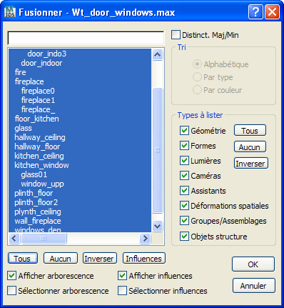 Fusionner. Naviguez jusqu'au dossier \scenes\interoperability\AutoCAD\, sélectionnez le fichier wt_door_windows.max, puis cliquez sur Ouvrir. 3ds Max ouvre une boîte de dialogue Fusionner.