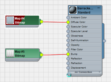 - Reliez le nouveau noeud Bitmap au composant Couleur diffuse du matériau Toit casernes.