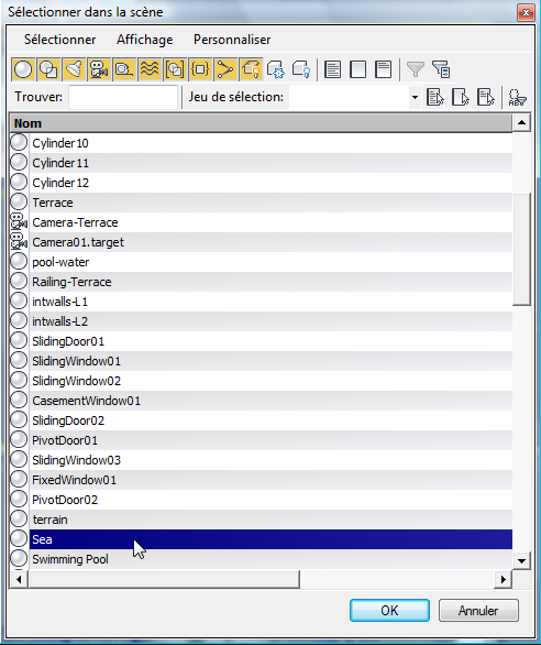 - Appuyez sur la touche H pour ouvrir la boîte de dialogue Sélectionner dans la scène. Cliquez sur l'objet Mer afin de le mettre en surbrillance, puis cliquez sur OK.