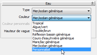 - Dans le panneau déroulant Eau, ouvrez la liste déroulante Couleur, puis choisissez Personnalisé.