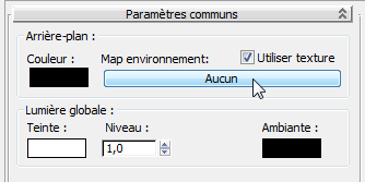 - Ouvrez le menu Rendu et sélectionnez Environnement pour ouvrir la boîte de dialogue Environnement et effets. Dans le panneau déroulant Paramètres communs, cliquez sur le bouton Texture environnement (le texte du bouton affiche pour l'instant "Aucun").