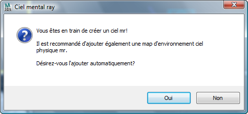 Une fois le bouton relâché, le système lumière du jour est créé et 3ds Max ouvre la boîte de dialogue Ciel mental ray, laquelle vous demande si vous souhaitez créer une map d'environnement Ciel physique mr.