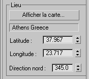 Une fois que vous avez cliqué sur OK, 3ds Max positionne l'objet soleil du système lumière du jour de façon à modéliser la latitude et la longitude réelles d'Athènes, en Grèce.