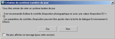 3ds Max ouvre la boîte de dialogue Création du système Lumière du jour, recommandant une valeur d'exposition optimale pour mental ray.