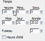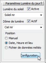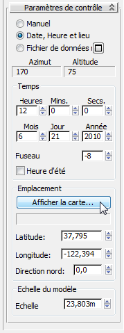 Temps permet de modifier la date et l'heure du jour, paramètres qui affectent également la position du soleil. La scène que vous allez illuminer et dont vous allez effectuer le rendu se situe en milieu d'après-midi, à 3h00 pm ou 15h00.
