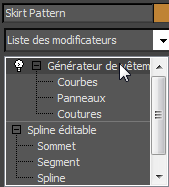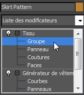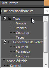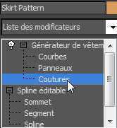 (icône représentant le signe +) pour ouvrir la hiérarchie du modificateur Fabricant de vêtement, si elle n'est pas déjà visible. Ensuite, cliquez sur le niveau sous-objet Coutures afin de l'activer.