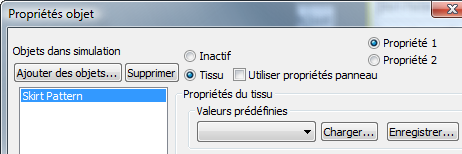 liste Objets dans simulation, cliquez sur l'objet Modèle jupe pour le mettre en surbrillance, puis sélectionnez Tissu.