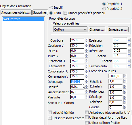 - Dans la zone Propriétés du tissu, remplacez la valeur du champ Etirement U par 50,0 (ce qui modifie également la valeur du champ Etirement V). Remplacez la valeur du champ Découpage par 180,0. Laissez les autres paramètres inchangés.