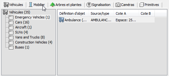 Dans cette leçon, vous allez ajouter du mobilier urbain à la route. Ces objets se trouvent dans la catégorie Civil View Objets placés.
