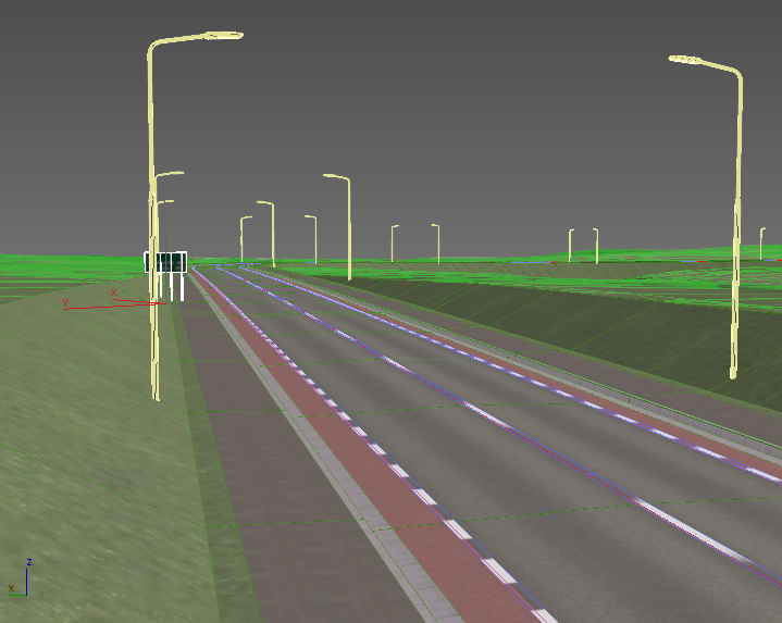 Dans la fenêtre, les lampadaires apparaissent maintenant sur le bord de la route. Ils sont plus faciles à voir si vous appuyez sur la touche F4 pour activer les faces délimitées.