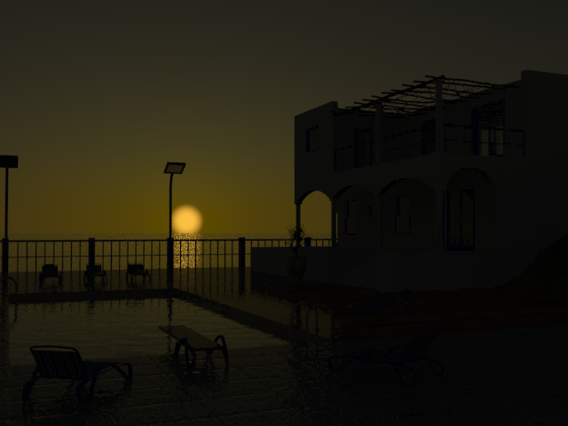 L'ombrage Ciel physique mr produit un dégradé vif du ciel et les détails autour de la piscine sont beaucoup plus visibles.