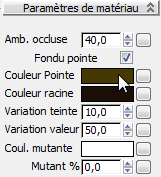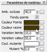 Le modificateur Hair and Fur dégrade la couleur des poils de barbe depuis la couleur des racines, dans laquelle ils commencent, jusqu'à celle des pointes, dans laquelle ils se terminent. Toutefois, la couleur réelle des poils varie généralement et vous pouvez utiliser la couleur mutante pour modéliser ces variations.