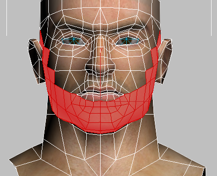 sélectionner les polygones de la zone où la barbe poussera. Servez-vous de l'illustration ci-dessous à titre de référence. Si la fenêtre n'affiche pas les arêtes d'une face, appuyez sur la touche F4 pour activer l'affichage Faces délimitées.