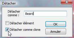- Dans la boîte de dialogue Détacher, activez l'option Détacher comme clone. Nommez les faces détachées Barbe, puis cliquez sur OK.