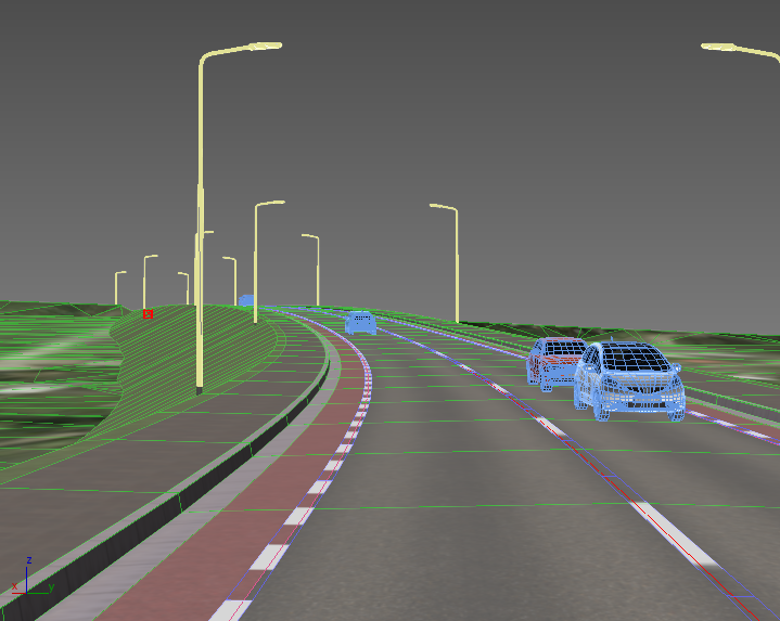 3ds Max Design ajoute une caméra animée à la scène. Si vous déplacez la glissière de temps, vous pouvez voir l'objet caméra se déplacer le long de la route.