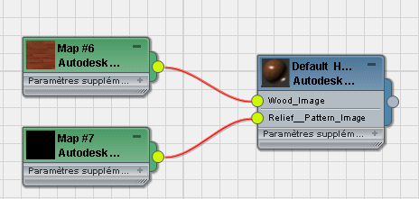 groupe mental ray.) Le matériau Bois de feuillu dispose de deux bitmaps intégrés. Dans l'éditeur de matériaux détaillé, cliquez sur (Cadrer) pour voir le noeud principal du matériau et les deux noeuds de bitmap.