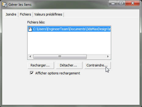 Gérer les liens. 3ds Max ouvre la boîte de dialogue Gestionnaire de liaisons de fichier.