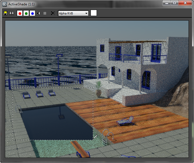 Lorsque vous dessinez une zone à soumettre au rendu (cliquez avec le bouton droit de la souris sur la fenêtre du flotteur ActiveShade et choisissez Dessiner région), le rendu iray ou mental ray effectue uniquement le rendu de cette région, mais il n'efface pas le reste de la fenêtre comme le fait le rendu lignes de balayage.