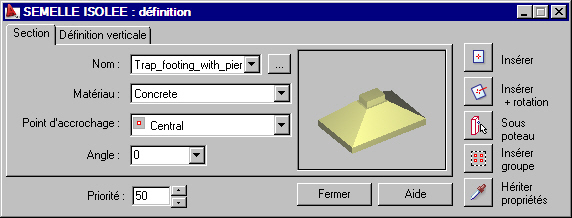 (Insérer) pour créer une semelle isolée à partir des paramètres que vous définissez dans la boîte de dialogue.
