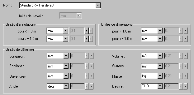 La boîte de dialogue Préférences de l'affaire vous permet de spécifier les unités de différents paramètres.