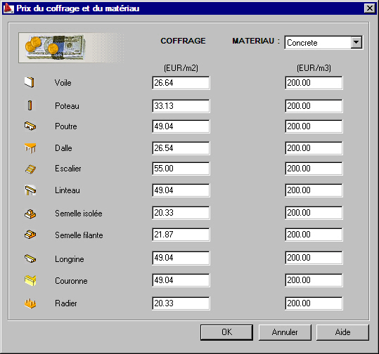 - le prix du coffrage pour chaque élément composant la structure BA (en euros par mètre carré de coffrage) ;