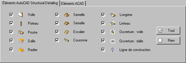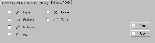 Si vous désactivez une option dans l'onglet Eléments Autodesk AutoCAD Structural Detailing ou Eléments ACAD, ce type d'élément ne sera pas pris en compte lors de la création des lignes de cote.