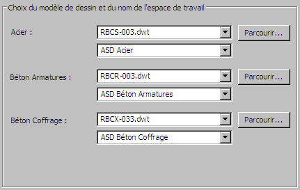 Sélectionnez l'onglet Béton Coffrage pour choisir le modèle de dessin à ouvrir au lancement des modules Autodesk AutoCAD Structural Detailing - Reinforcement (lors de l'exportation des dessins de coffrage vers Autodesk AutoCAD Structural Detailing - Reinforcement).
