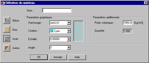 Dans la boîte de dialogue Définition du matériau, vous pouvez définir ou modifier un matériau pour un type de matériau prédéfini :