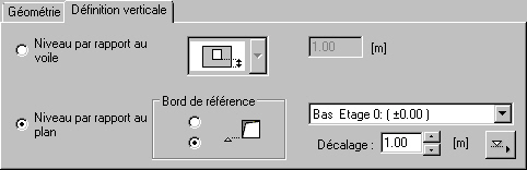 Dans l'onglet Définition verticale de la boîte de dialogue Fenêtre : définition, vous pouvez spécifier la position d'une fenêtre par rapport à un voile ou à un plan.