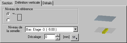 Dans l'onglet Définition verticale de la boîte de dialogue Semelle filante : définition, vous pouvez spécifier la position de la semelle filante par rapport à un étage actif.