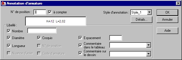 Les options dans cette boîte de dialogue permettent de définir l’annotation des armatures. Vous pouvez le faire en désactivant les variables actives initialisées à partir de la syntaxe définie. Une fois la forme de l'armature définie, la boîte de dialogue suivante s'affiche :